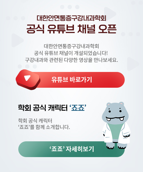 대한안면통증구강내과학회 공식 유튜브 채널 개설 및 캐릭터 소개 대한안면통증구강내과학회 공식 유튜브 채널 개설 안내 대한안면통증구강내과학회의 공식 유튜브 채널이 개설되었습니다. 앞으로 구강내과와 관련된 다양한 정보를 영상으로 만나보실 수 있습니다. 많은 분들의 관심과 구독을 부탁드립니다. ▶ 유튜브 채널 바로가기 학회 공식 캐릭터 ‘죠죠’를 소개합니다. 죠죠는 대한안면통증구강내과학회를 대표하는 공식 캐릭터입니다. 이름은 ‘턱(jaw)’에서 유래하였으며, 튼튼한 턱을 상징하는 하마의 모습을 본떠 만들어졌습니다. 턱관절 질환으로 고생하는 환자분들이 건강하고 편안한 턱을 되찾기를 바라는 따뜻한 마음을 담고 있습니다. 앞으로 죠죠는 학회의 다양한 영상에서 함께할 예정이니 많은 관심 부탁드립니다. 2025-11-06